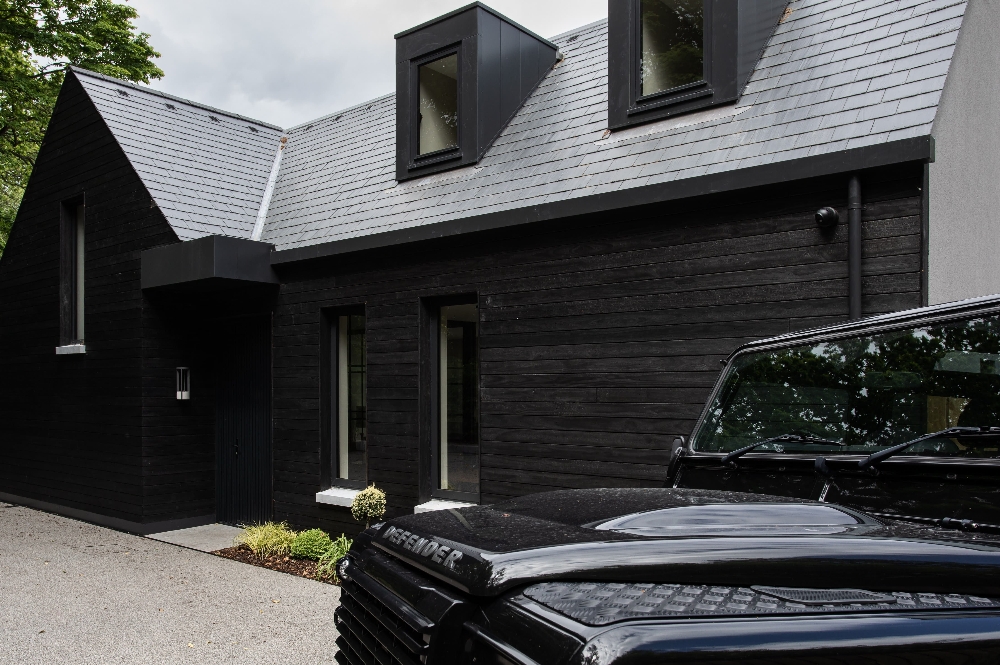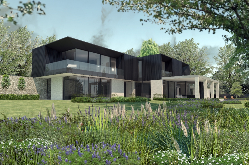 An elegant modern villa with cantilevering forms, overlooking the River Clyde, South Lanarkshire