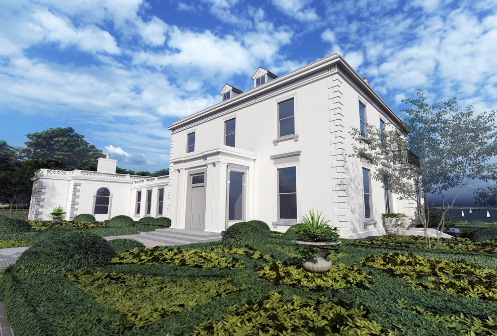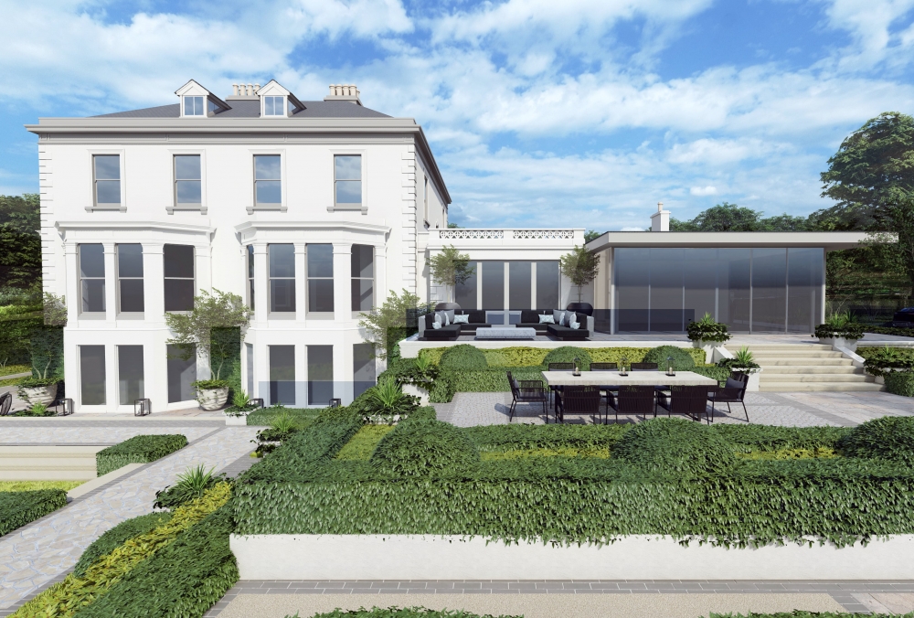 The rear of the house showcases two large bay windows that overlook the formal garden area, which includes a pond and a seating area designed for enjoying the tranquillity of the gardens. These bay windows not only provide picturesque views but also enhance the sense of connection between the interior and the lush outdoor spaces.